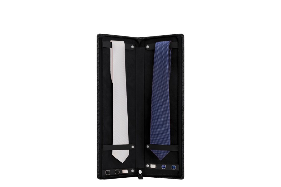 Elegant und praktisch schützt diese Krawattenmappe aus Leder perfekt Ihre Krawatten und Manschettenknöpfe auf Reisen. Als absoluter Bestseller, insbesondere bei jenen, die viel unterwegs sind, lässt sich diese Krawattenaufbewahrung aus Leder mit einem Reißverschluss verschließen und dient zur Unterbringung von bis zu 2 Krawatten (1 auf jeder Seite), die von 2 Schlaufen mit Druckknopfverschluss gehalten werden. Zwei funktionale Lederbänder mit Schlitzen dienen außerdem der Aufbewahrung von bis zu 3 Paar Manschettenknöpfen.