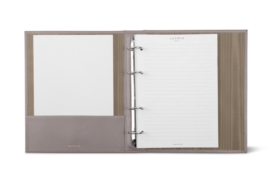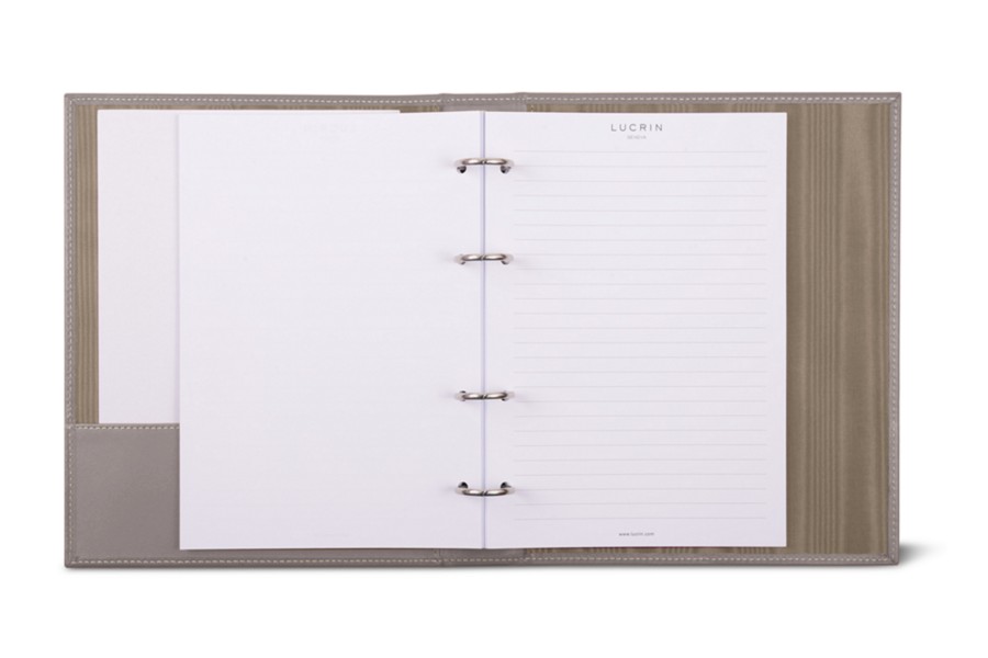 Dieser A5-Ringordner aus Leder mit 4 vernickelten Ringen und einem Volumen von ungefähr 100 Blättern gehört zu den Favoriten von Geschäftsleuten. Die erlesene Verarbeitung und das echte Premium-Leder machen diesen Luxusbüroartikel zu einem Must-have, wenn Sie gut sortierte Unterlagen mit einem Hauch Eleganz zu schätzen wissen. Er besitzt auch ein flaches Fach (18 x 6,5 cm) auf der linken Seite des steifen A5-Büroordners – Sie können zusätzliche Blätter oder kleine Dokumente darin unterbringen.