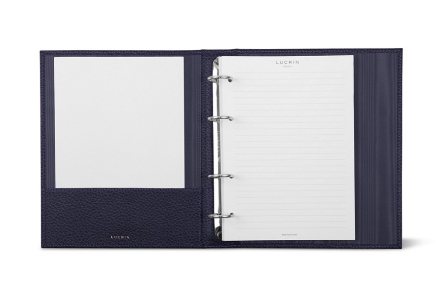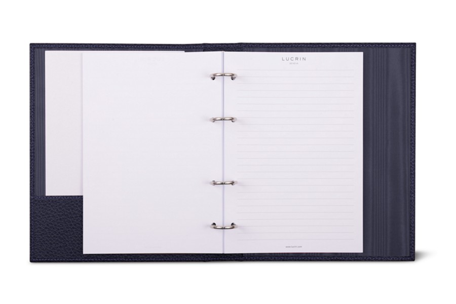 Dieser A5-Ringordner aus Leder mit 4 vernickelten Ringen und einem Volumen von ungefähr 100 Blättern gehört zu den Favoriten von Geschäftsleuten. Die erlesene Verarbeitung und das echte Premium-Leder machen diesen Luxusbüroartikel zu einem Must-have, wenn Sie gut sortierte Unterlagen mit einem Hauch Eleganz zu schätzen wissen. Er besitzt auch ein flaches Fach (18 x 6,5 cm) auf der linken Seite des steifen A5-Büroordners – Sie können zusätzliche Blätter oder kleine Dokumente darin unterbringen.