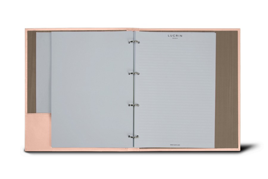 Dieses Ringbuch im A4-Format ist aus natürlichem, echtem Leder gemacht und wurde von den besten Kunsthandwerkern geschickt veredelt. Es hat vier kleine Ringe, die ungefähr 100 Blatt 80 g Papier fassen. Ein flaches Fach (25,5 cm x 8,5 cm) an der linken Seite erlaubt es Ihnen, weitere Dokumente zu verstauen. Das lederne A4-Ringbuch von Lucrin ist das perfekte Luxus-Accessoire für Ihr Büro, für die Menschen, die Ordnung schätzen.