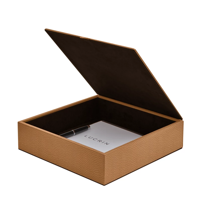 Aufbewahrungsablagen sind stets eine große Bereicherung für das Büro oder Zuhause. Diese Ablage mit großzügigen Abmessungen besteht aus einem mit Naturleder bezogenen Holzgefäß. Sie ist ein wunderschönes Deko-Objekt, das sich dank der großen Farbauswahl perfekt an Ihre Inneneinrichtung anpassen lässt. Mit den anderen beiden Aufbewahrungsablagen aus der Lucrin Kollektion können Sie sich atemberaubende Sets zusammenstellen. Egal ob für Büroaccessoires, Hightech, Post oder andere Gegenstände, in dieser Aufbewahrungsbox ist alles ordentlich verstaut und lässt sich leicht wiederfinden. Unordnung in Ihrem Alltag gehört nun der Vergangenheit an.