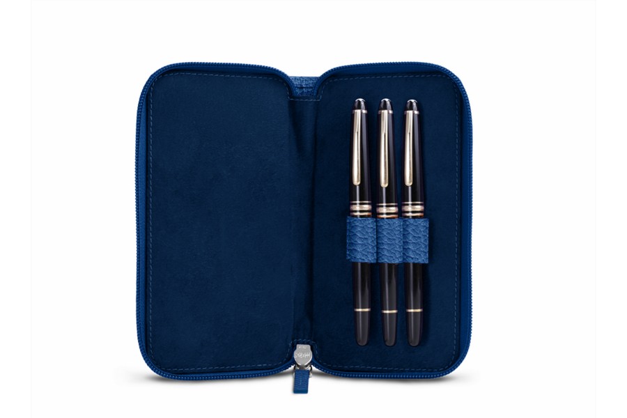 Täschchen für 3 Füllfederhalter mit Reißverschluss - Königsblau - Genarbtes Leder