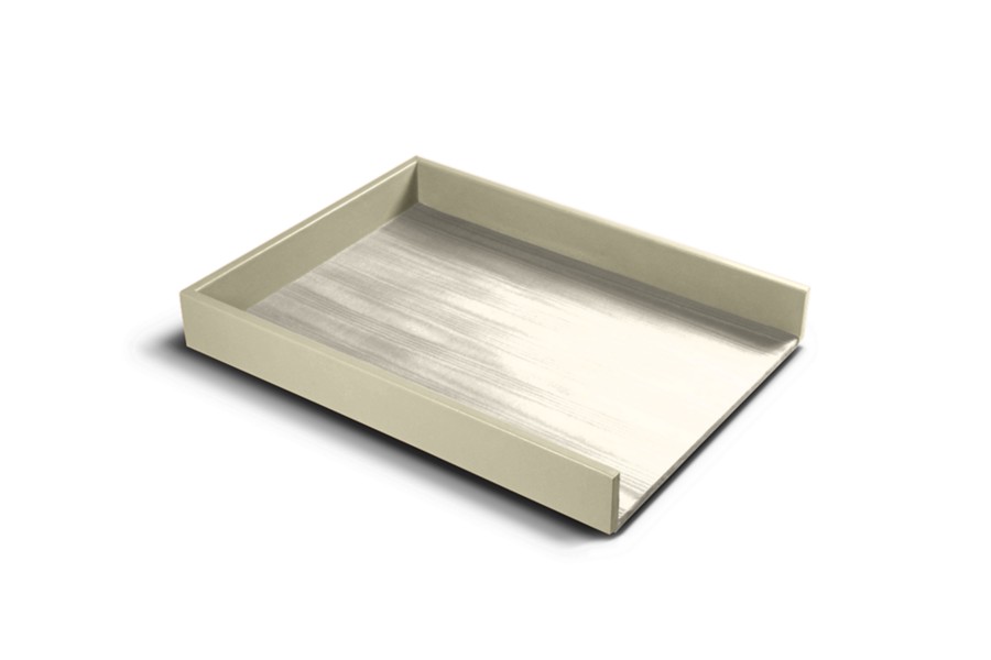 Papierablage A5 mit Holzstruktur und Lederüberzug aus Rindsleder. Stoffboden.