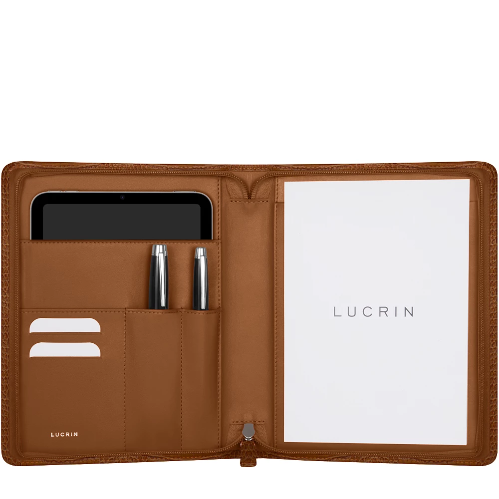 Entdecken Sie diese praktische Mappe, die Ihr Notizblock im A5-Format und ihre unverzichtbaren Hightech-Gadgets auf einmal beherbergen kann. Diese Mappe aus echtem Leder besitzt einen Reißverschluss und eignet sich für sämtliche A5-Tablets von bis zu 11 Zoll sowie Smartphones, Kopfhörer, Stifte, Bleistifte und ein paar Visitenkarten. Das Dokumenten-Etui kann in einer großen Auswahl an Lederarten und Farben und zum Beispiel mit einer einzigartigen Gravur personalisiert werden.