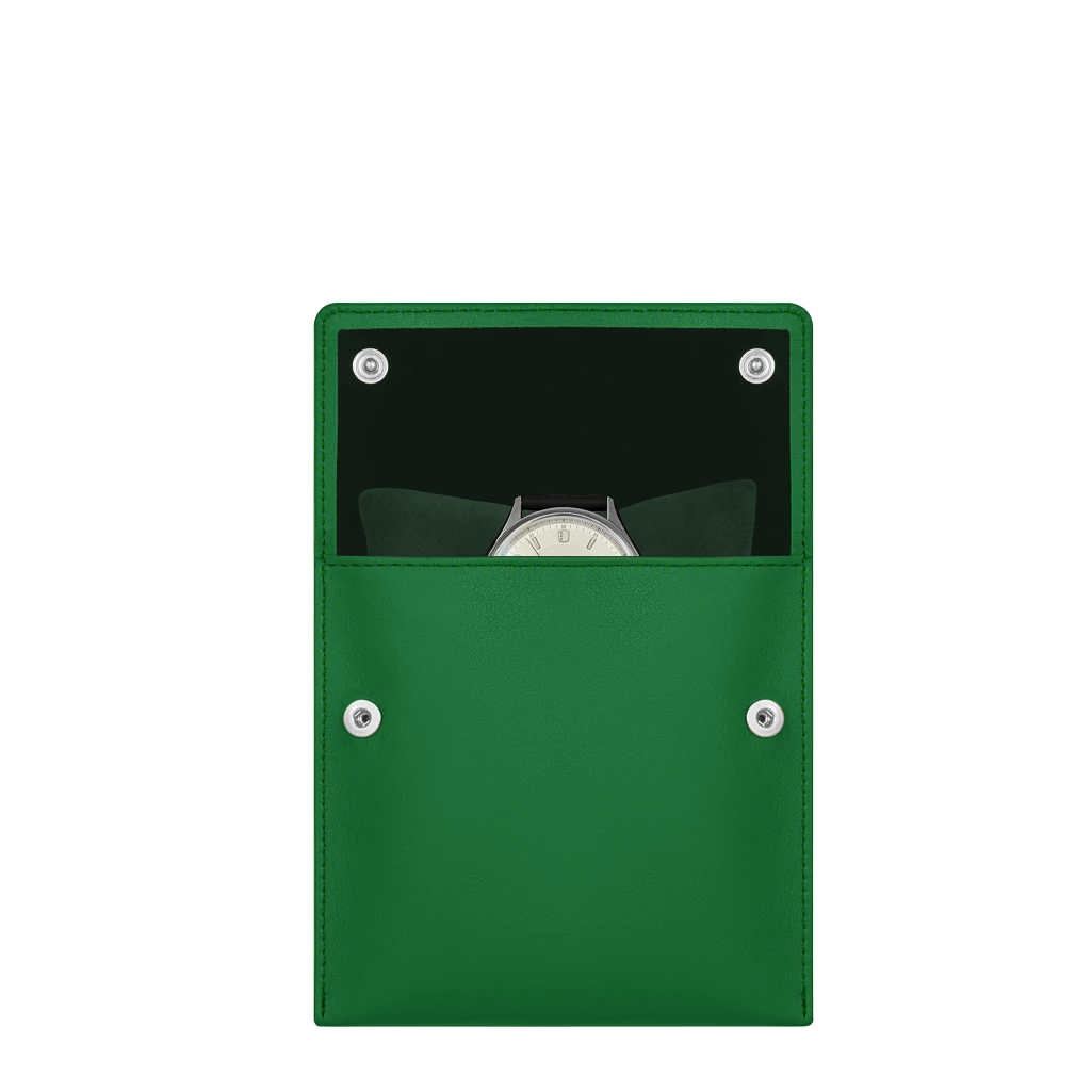 Quadratisches weiches Uhrenetui mit einem Uhrenkissen. Klappverschluss mit zwei Druckknöpfen. Ausführung in Lammleder.